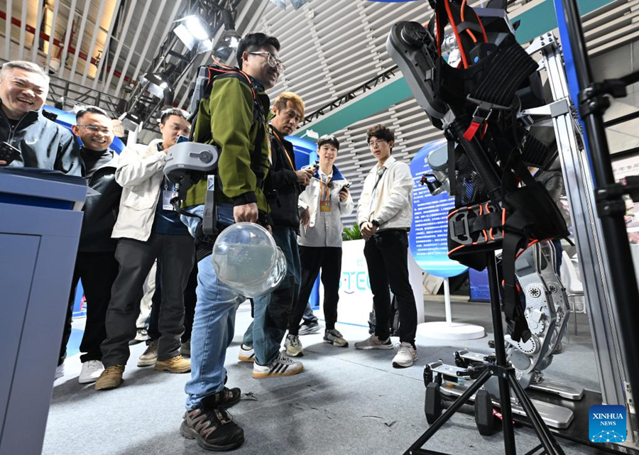 | Foto ini menunjukkan seorang pengunjung mencuba gear exoskeleton untuk mengangkat berat. (Xinhua/Li He) |