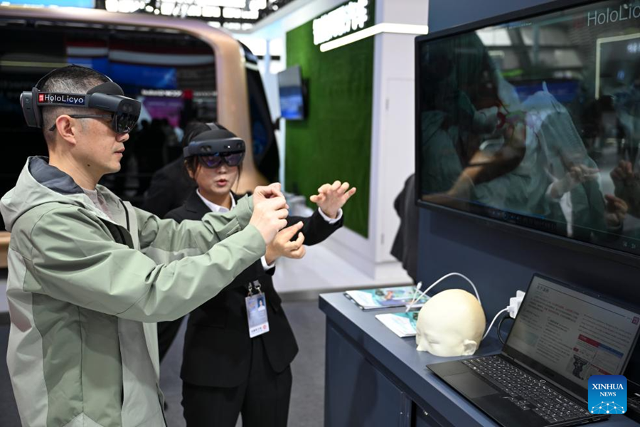 | Foto ini memaparkan seorang pengunjung sedang mencuba sistem pengimejan perubatan holografik pintar di bawah seliaan seorang staf di situ. (Xinhua/Cai Xiangxin) |