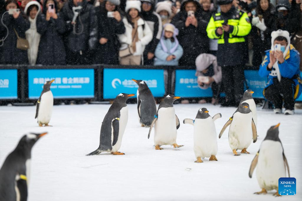 Pada Selasa, 10 ekor penguin dibawa keluar dari Taman Polar Harbin, Provinsi Heilongjiang di timur laut China untuk tatapan awam di bandar.
