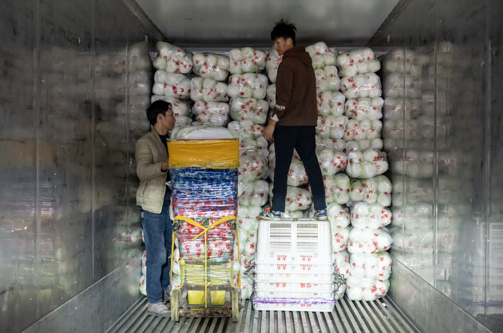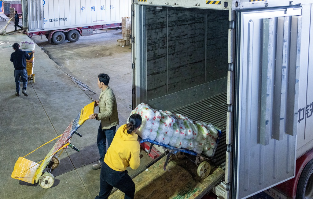 | Gambar ini memperlihatkan sayur-sayuran dimuatkan ke dalam kontena untuk logistik rantaian sejuk di kaunti Tonghai pada 1 Dec 2024. (Xinhua/Chen Xinbo) |
