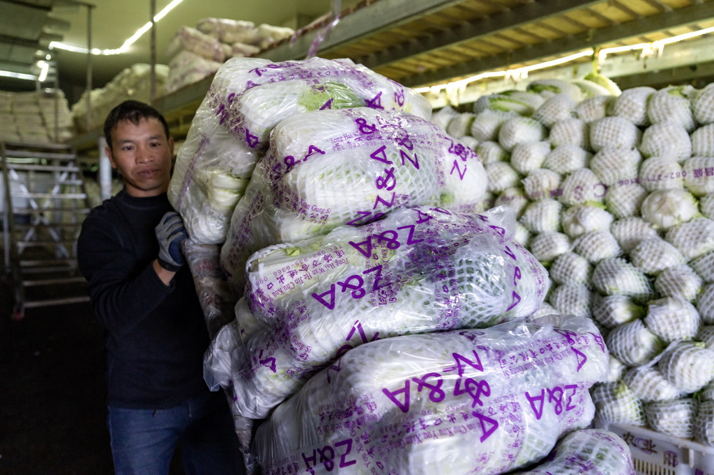 | Gambar ini menunjukkan seorang pekerja sedang memindahkan sayur-sayuran di tempat simpanan sejuk beku di kaunti Tonghai pada 1 Dec 2024. (Xinhua/Chen Xinbo) |