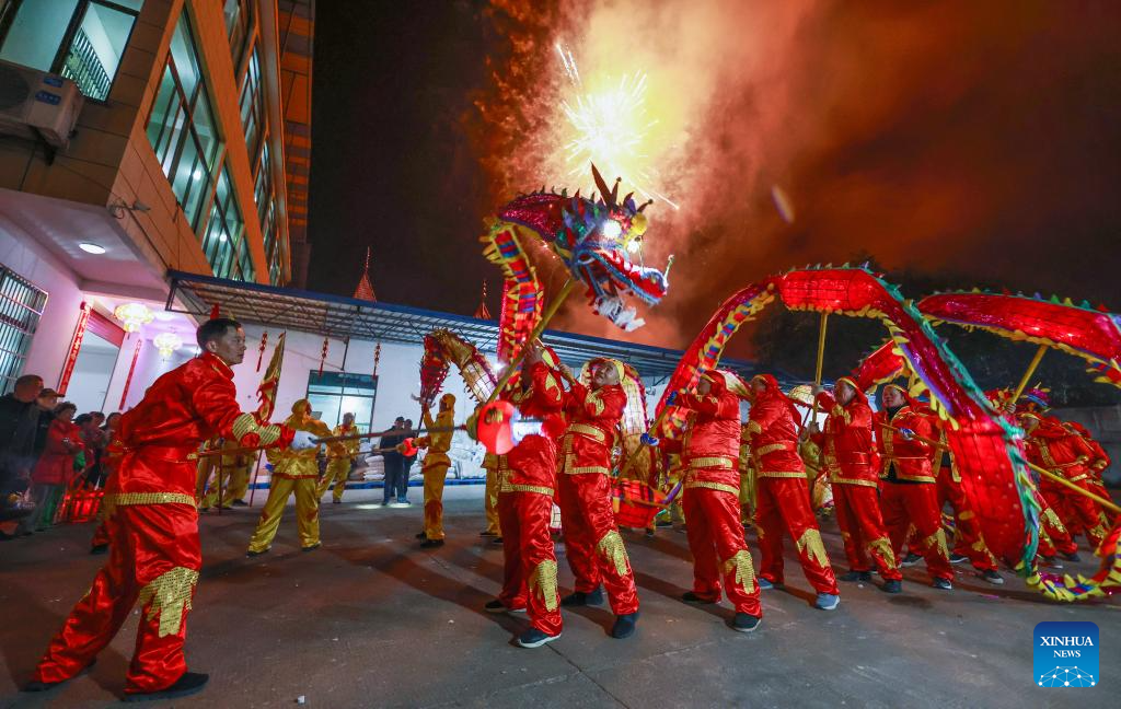 | Penduduk kampung tempatan mempersembahkan tarian naga untuk meraikan Tahun Baru Cina di Kampung Kuangting, Pekan Anhua di Bandar Zhuji di Provinsi Zhejiang timur China, 10 Februari 2024. (Xinhua/Xu Yu) |