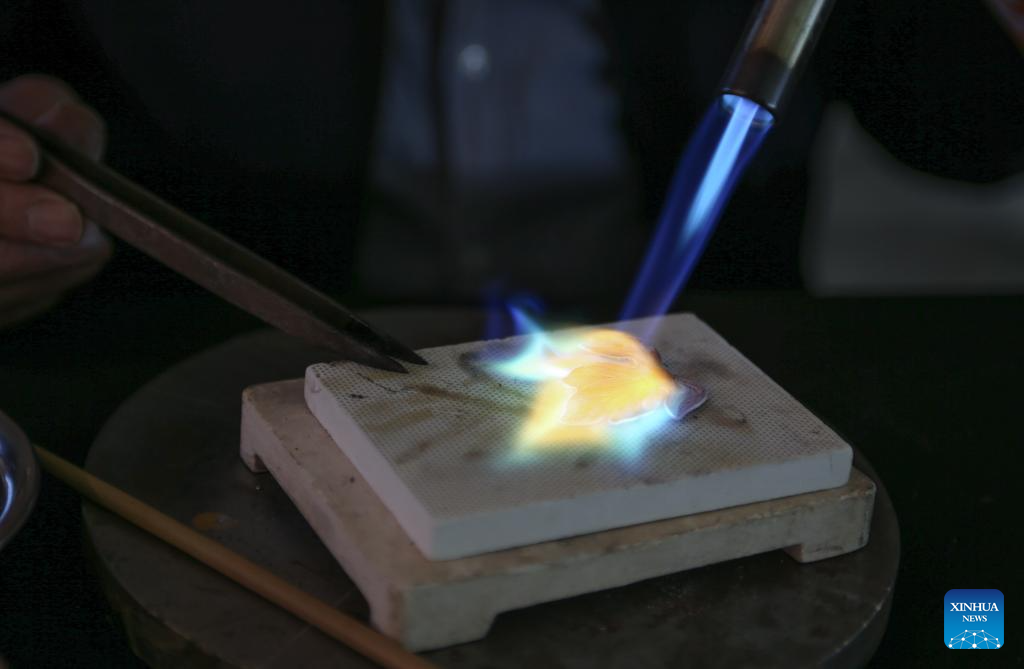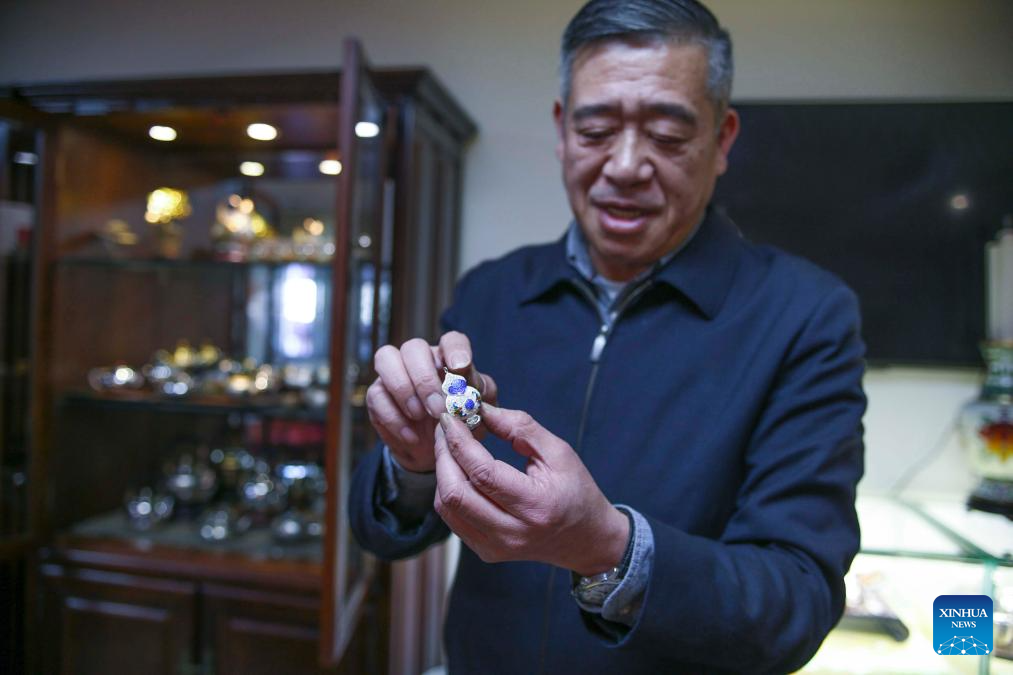 | Dong Ruijing menunjukkan hiasan dengan seni Mozek Filigri di studionya di Beijing, ibu negara China, 3 Disember 2024. (Xinhua/Zhu Weixi) |