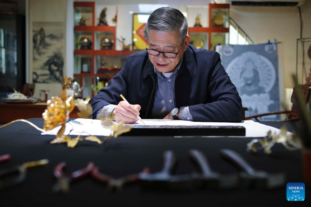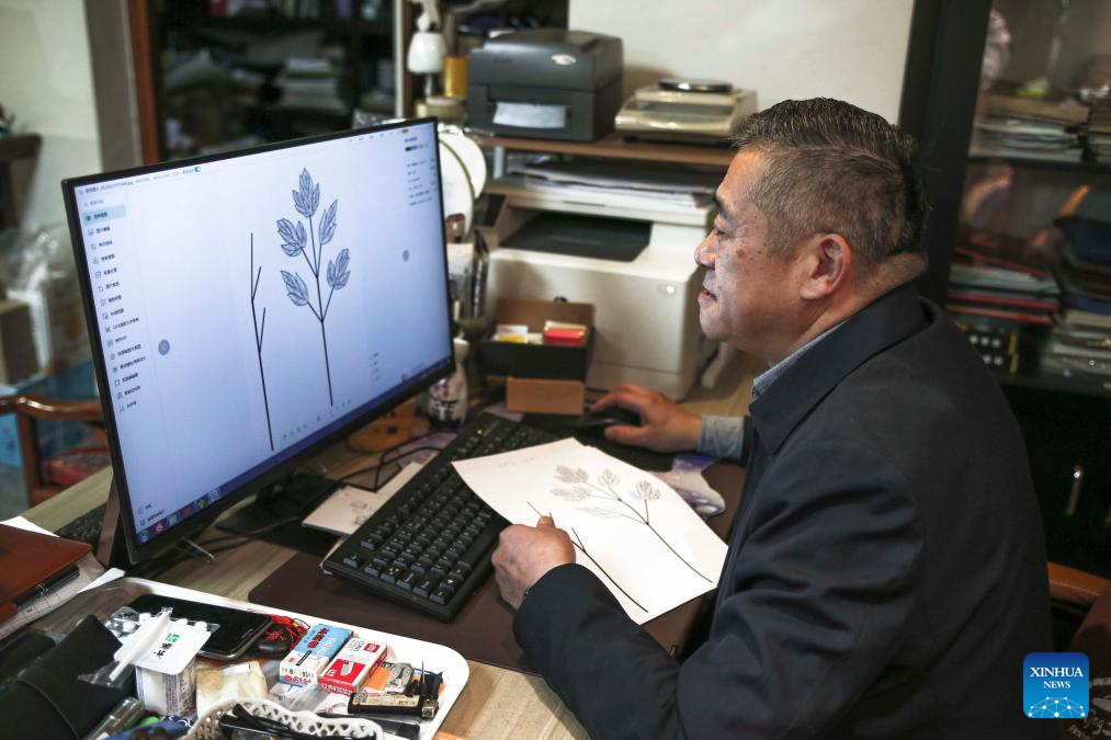 | Dong Ruijing melakar reka bentuk karya seni Mozek Filigri di studionya di Beijing, ibu negara China, 3 Disember 2024. (Xinhua/Zhu Weixi)