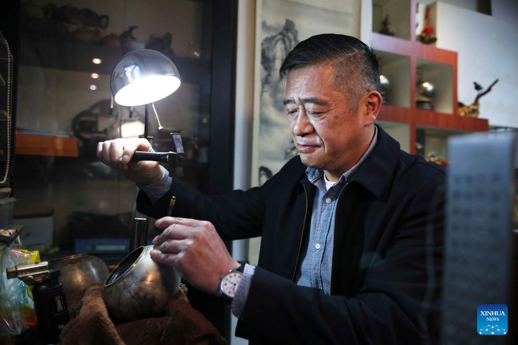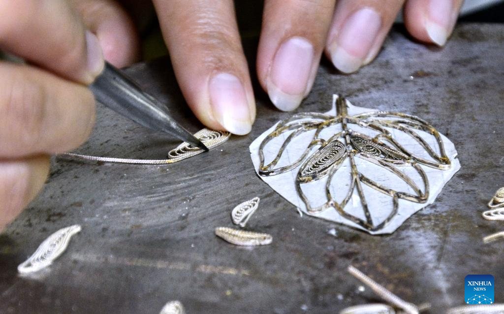 | Seorang perantis Dong Ruijing membuat karya seni Mozek Filigri di studionya di Beijing, ibu negara China, 3 Disember 2024. (Xinhua/Li Xin) |