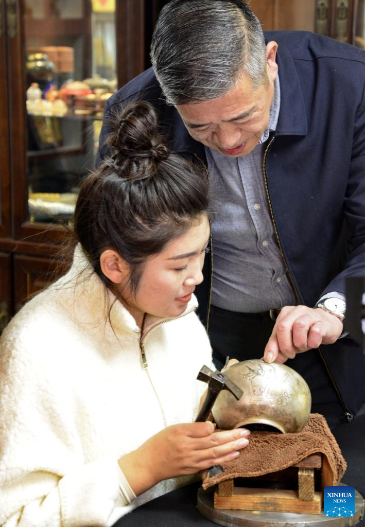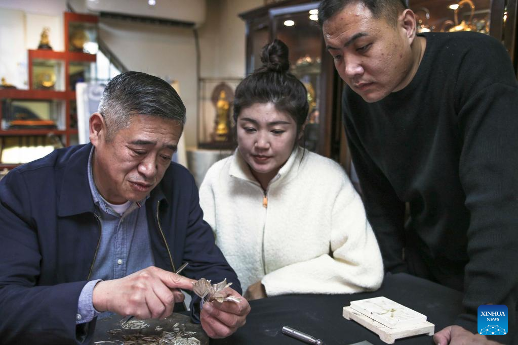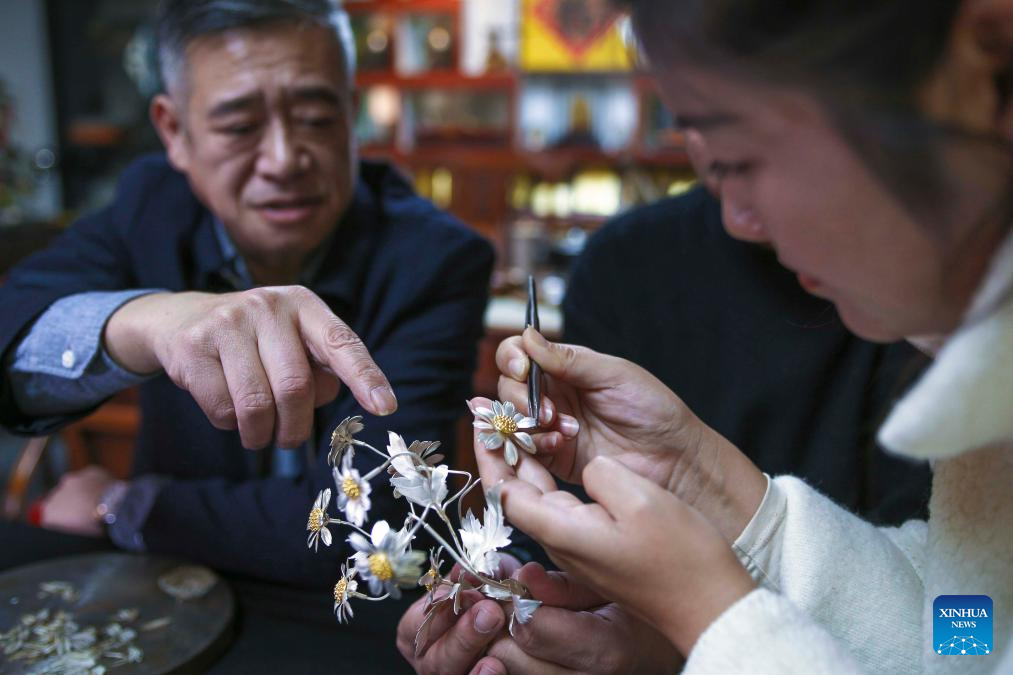 | Dong Ruijing mengajar seorang perantis tentang seni Mozek Filigri di studionya di Beijing, ibu negara China, 3 Disember 2024. (Xinhua/Li Xin) |