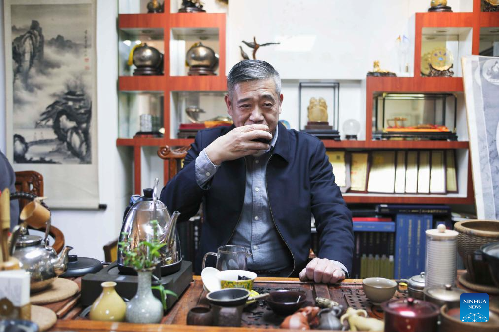 | Dong Ruijing berehat sambil minum teh di studionya di Beijing, ibu negara China, 3 Disember 2024. (Xinhua/Zhu Weixi) |