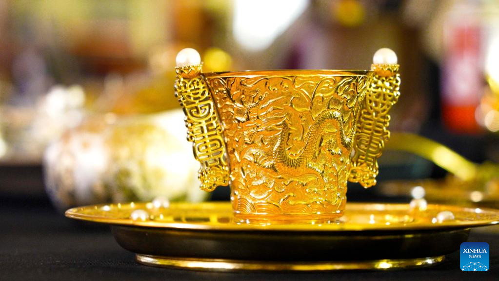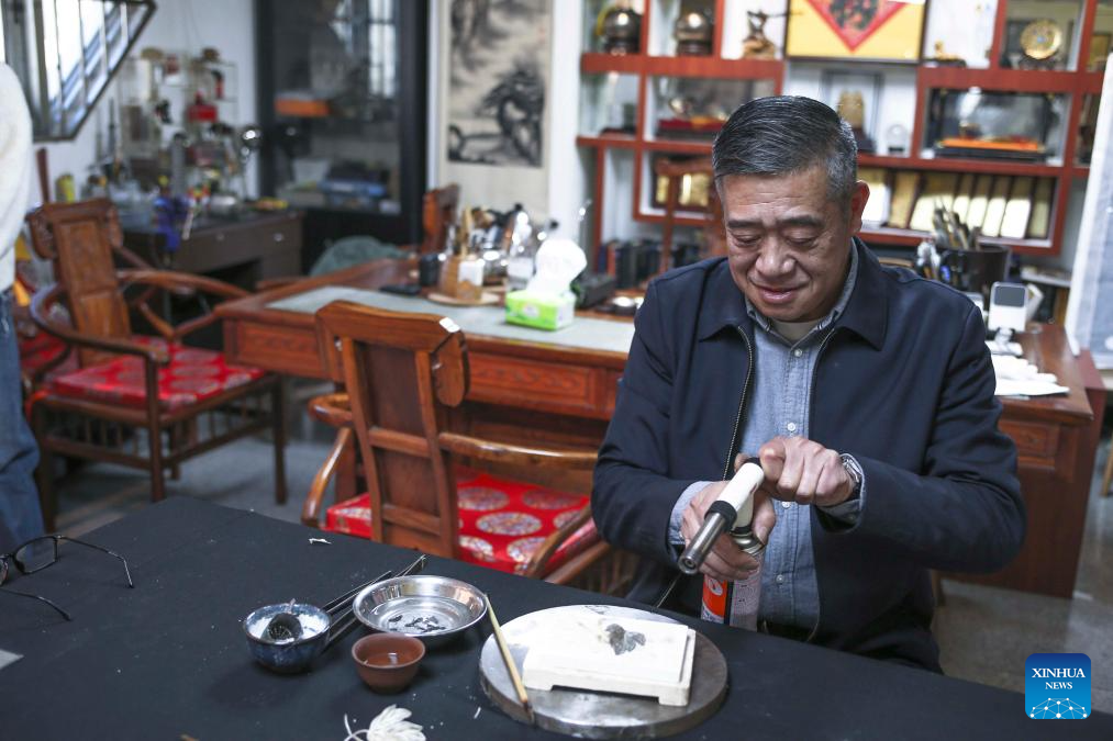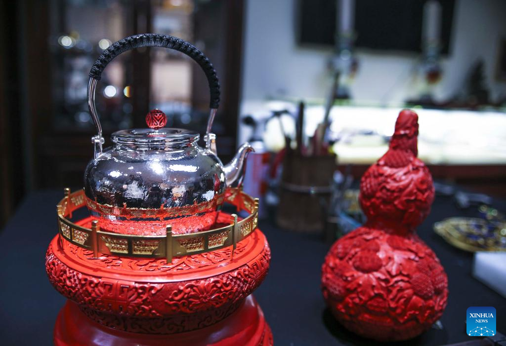 | Karya seni yang menyepadukan Mozek Filigri dan kraf ukiran lakuer dipamerkan di studio Dong Ruijing di Beijing, ibu negara China, 3 Disember 2024. (Xinhua/Li Xin) |