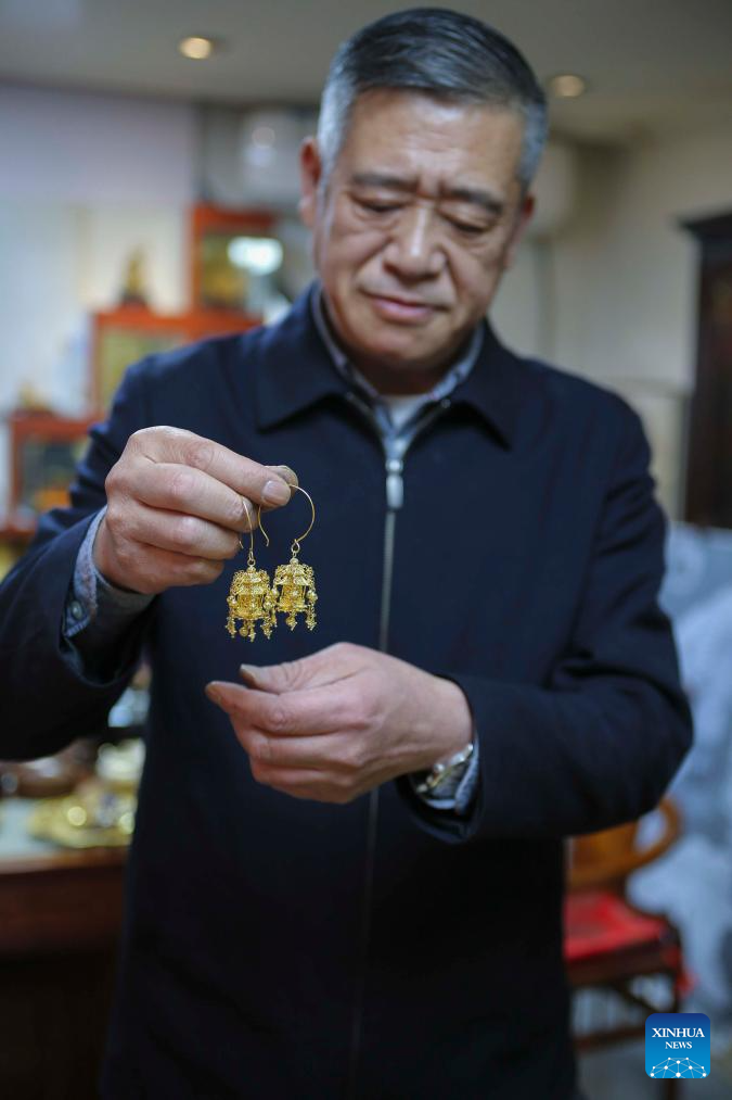| Dong Ruijing menunjukkan sepasang anting-anting Mozek Filigri di studionya di Beijing, ibu negara China, 3 Disember 2024. (Xinhua/Zhu Weixi) |