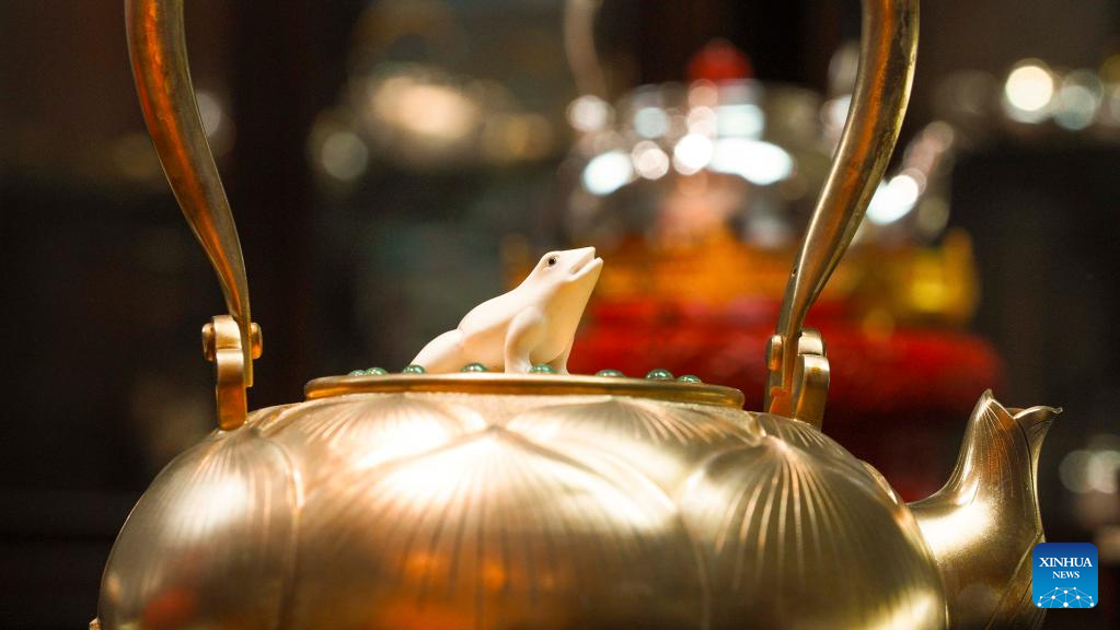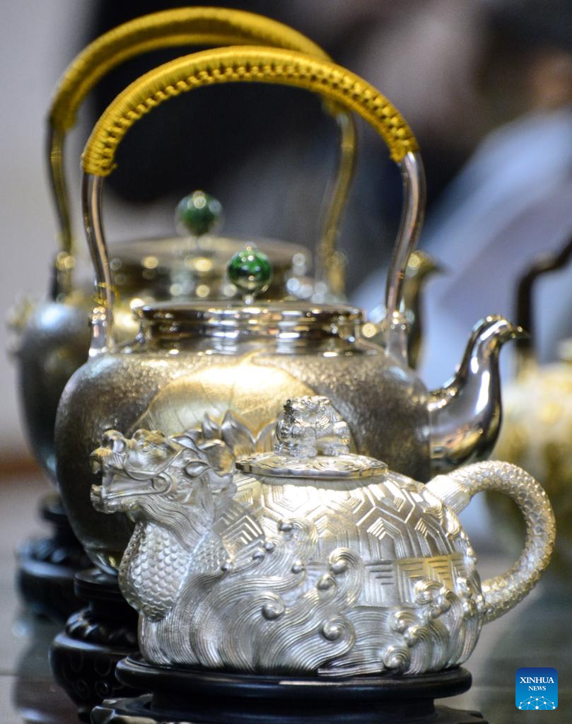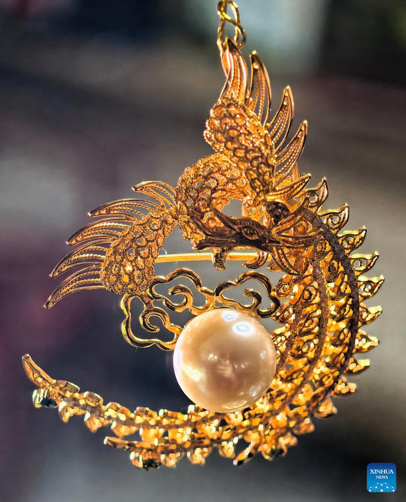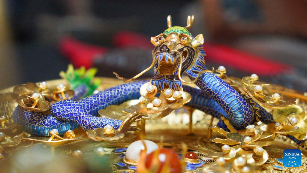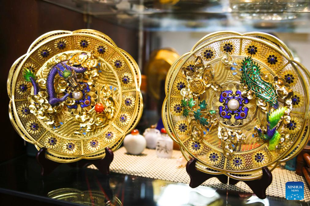 | Karya seni yang menyepadukan Mozek Filigri dan kraf ukiran gading dipamerkan di studio Dong Ruijing di Beijing, ibu negara China, 3 Disember 2024. (Xinhua/Qi Zhiyue) |