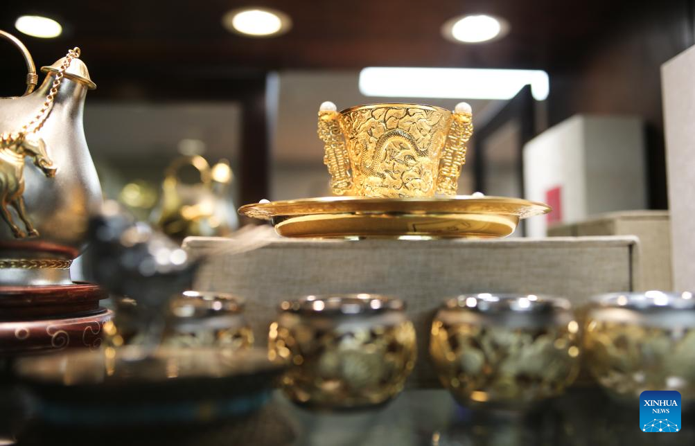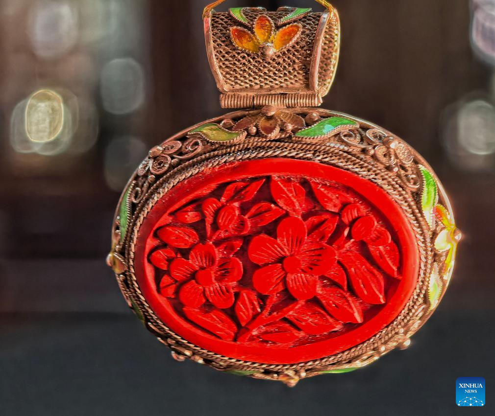 | Karya seni yang menyepadukan Mozek Filigri dan kraf ukiran lakuer dipamerkan di studio Dong Ruijing di Beijing, ibu negara China, 3 Disember 2024. (Xinhua/Zhu Weixi) |