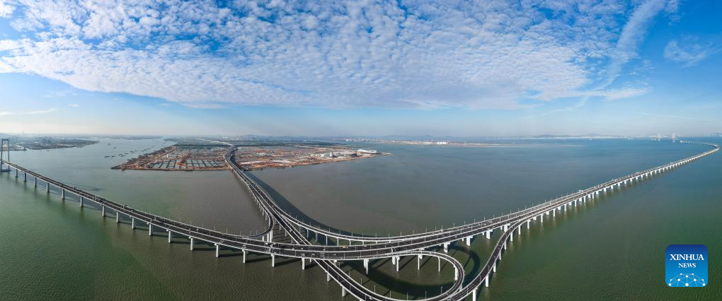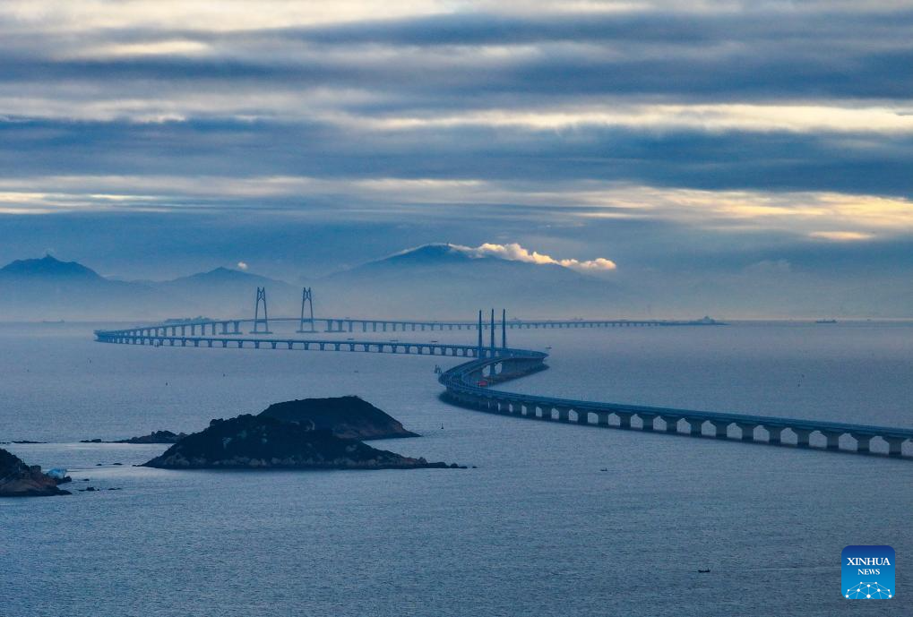 | Foto dron bertarikh 15 Disember 2023 ini menunjukkan pemandangan Jambatan Hong Kong-Zhuhai-Makau di selatan China. (Xinhua/Liu Dawei) |