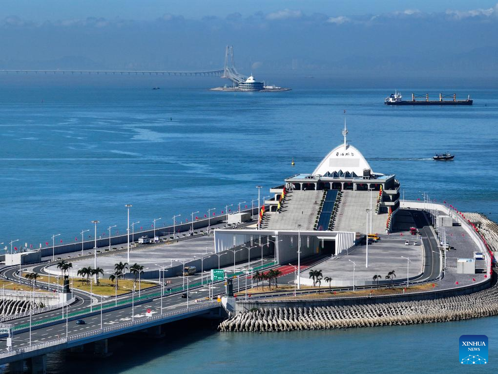 | Foto dron bertarikh 15 Disember 2024 ini menunjukkan pulau buatan timur dan barat Jambatan Hong Kong-Zhuhai-Makau di selatan China. (Xinhua/Liu Dawei) |