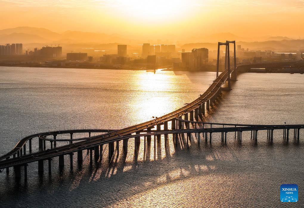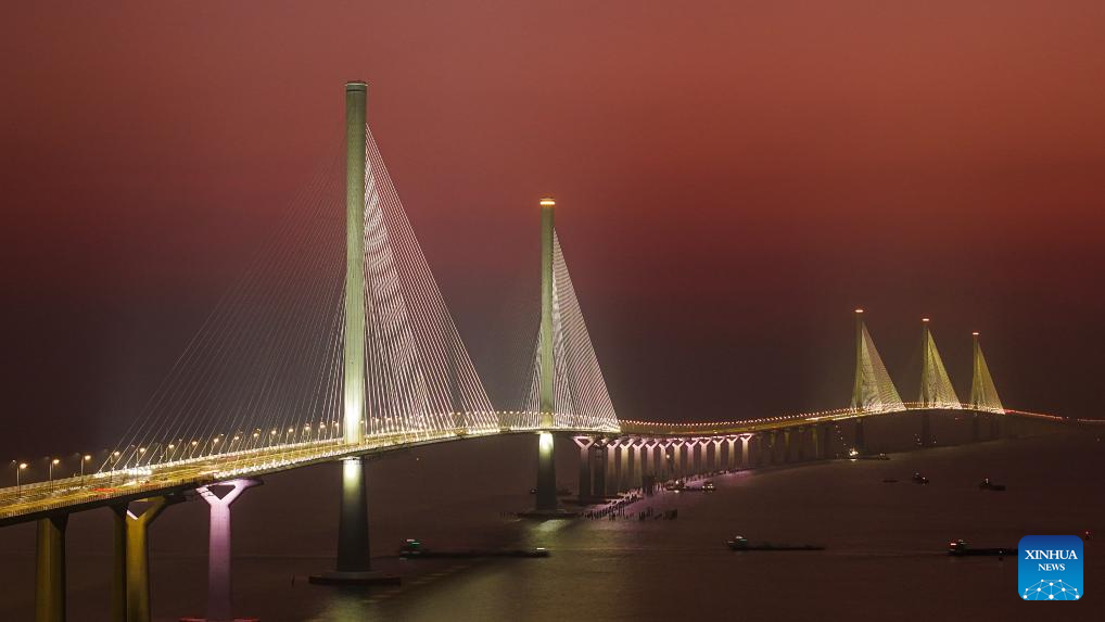 | Foto dron bertarikh 7 Disember 2024 ini menunjukkan pemandangan Jambatan Pelabuhan Gaolan (dengan menara berkembar utama di sebelah kiri) dan Jambatan Lintasan Laut Huangmao (dengan tiga menara utama di sebelah kanan) di provinsi Guangdong, selatan China. (Xinhua/Liu Dawei) |