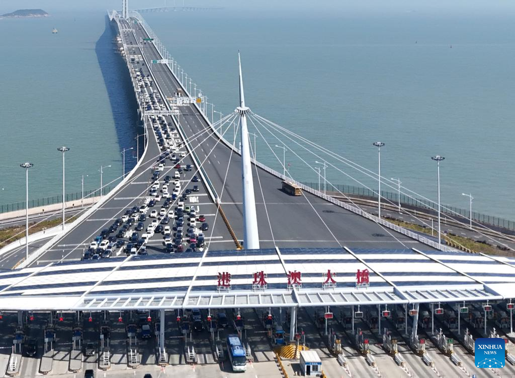| Foto dron bertarikh 12 Februari 2024 ini menunjukkan kenderaan di Jambatan Hong Kong-Zhuhai-Makau di selatan China. (Xinhua) |
