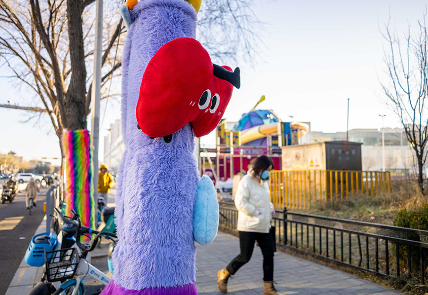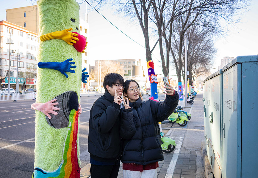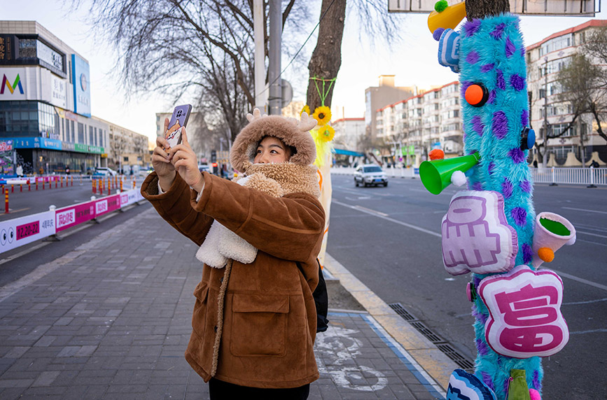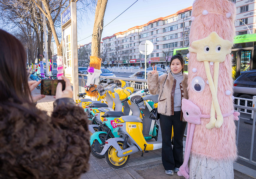 | Orang awam sedang membuat gaya ketika mengambil gambar bersama-sama dengan pokok yang memakai baju panas. (People’s Daily Online/ Ding Genhou) |