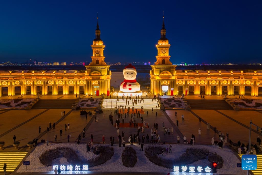 | Kanak-kanak sekolah membuat persembahan di hadapan orang salji gergasi. (Xinhua/Zhang Tao) |