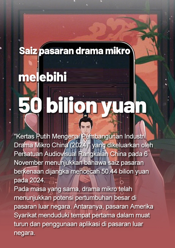 "Kertas Putih Mengenai Pembangunan Industri Drama Mikro China (2024)" yang dikeluarkan oleh Persatuan Audiovisual Rangkaian China pada 6 November menunjukkan bahawa saiz pasaran berkenaan dijangka mencecah 50.44 bilion yuan pada 2024.