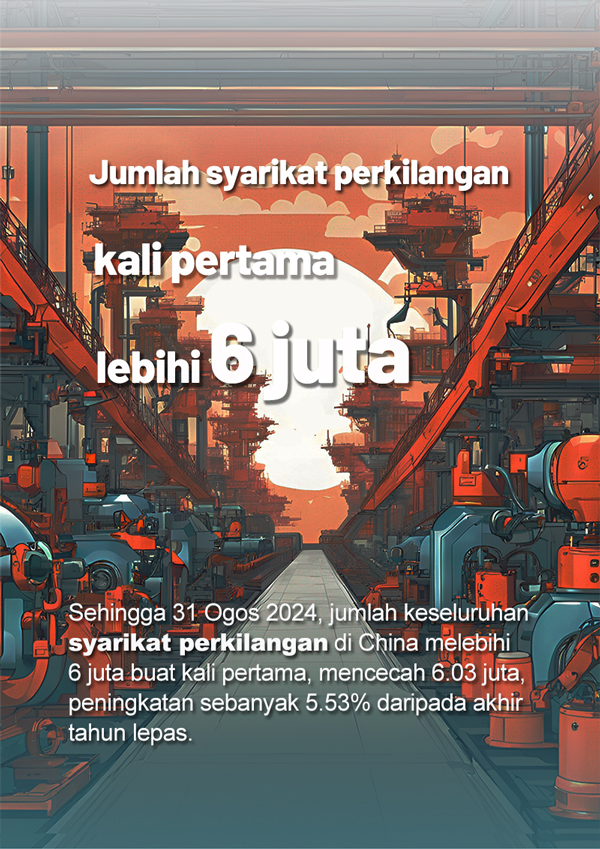 Sehingga 31 Ogos 2024, jumlah keseluruhan syarikat perkilangan di China melebihi 6 juta buat kali pertama, mencecah 6.03 juta, peningkatan sebanyak 5.53% daripada akhir tahun lepas.