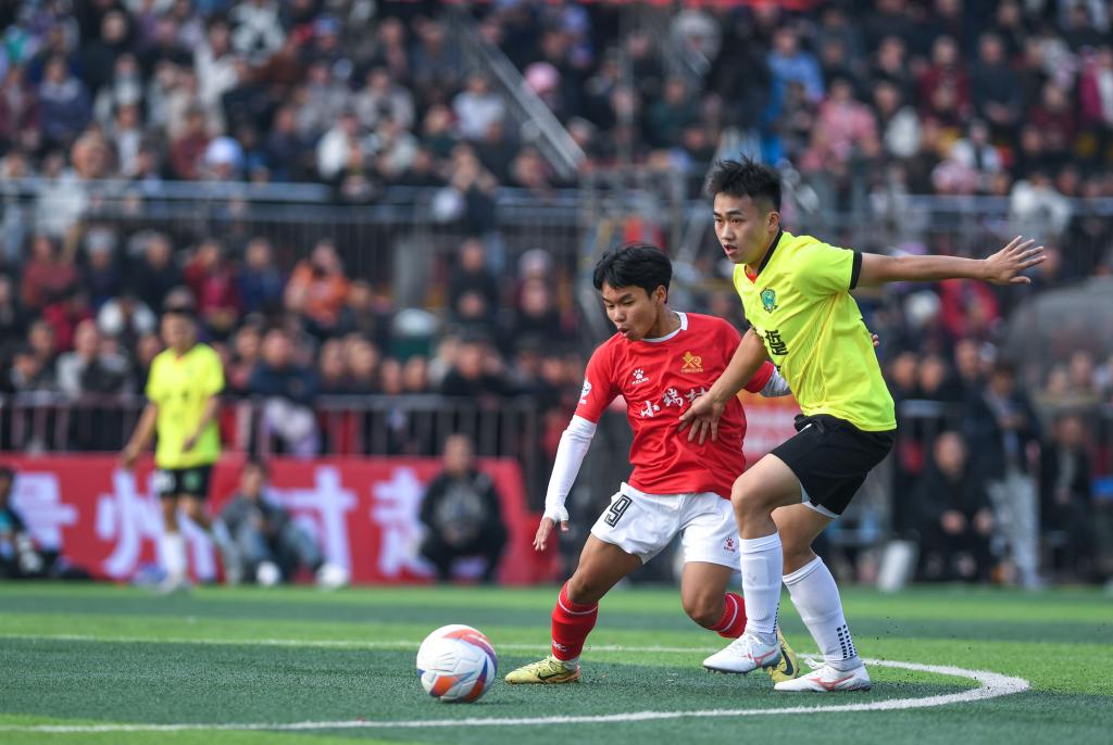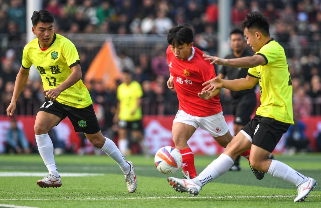 | Pemain dari pasukan kampung Xiaorui dan Panxue sedang merebut bola semasa perlawanan. |