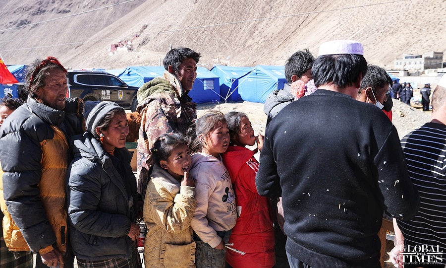 | Penduduk di kawasan yang terjejas akibat gempa sedang beratur untuk menerima bantuan makanan di Perbandaran Tsogo di kaunti Dingri, Xigaze, di Wilayah Autonomi Xizang pada 9 Januari 2025. (Global Times/Cui Ming) |