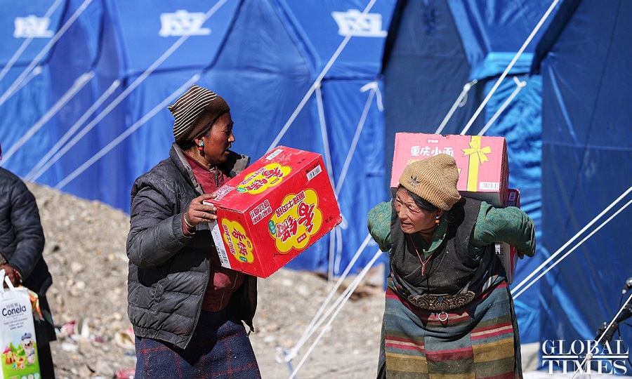 | Bantuan gempa seperti makanan, minuman dan keperluan harian dihantar secara berterusan di Perbandaran Tsogo di kaunti Dingri, Xigaze, di Wilayah Autonomi Xizang pada 9 Januari 2025. (Global Times/Cui Ming) |