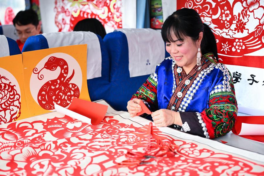| Seorang pewaris warisan budaya tidak ketara sedang mempamerkan kemahiran guntingan kertas kepada penumpang. (Xinhua/Yang Wenbin) |