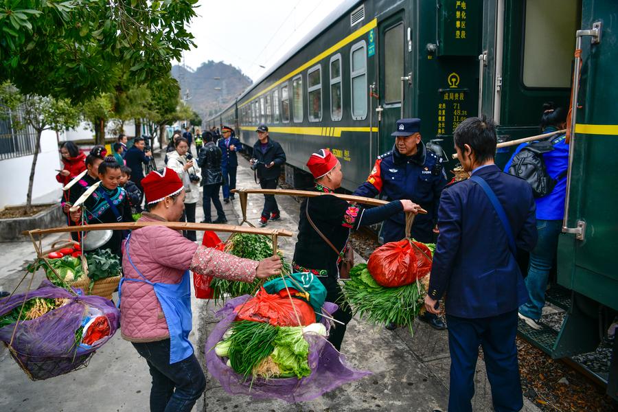 | Penduduk kampung sedang menunggu kereta api di Stensen Kereta Api Liugeji untuk menjual produk masing-masing. (Xinhua/Yang Wenbin) |