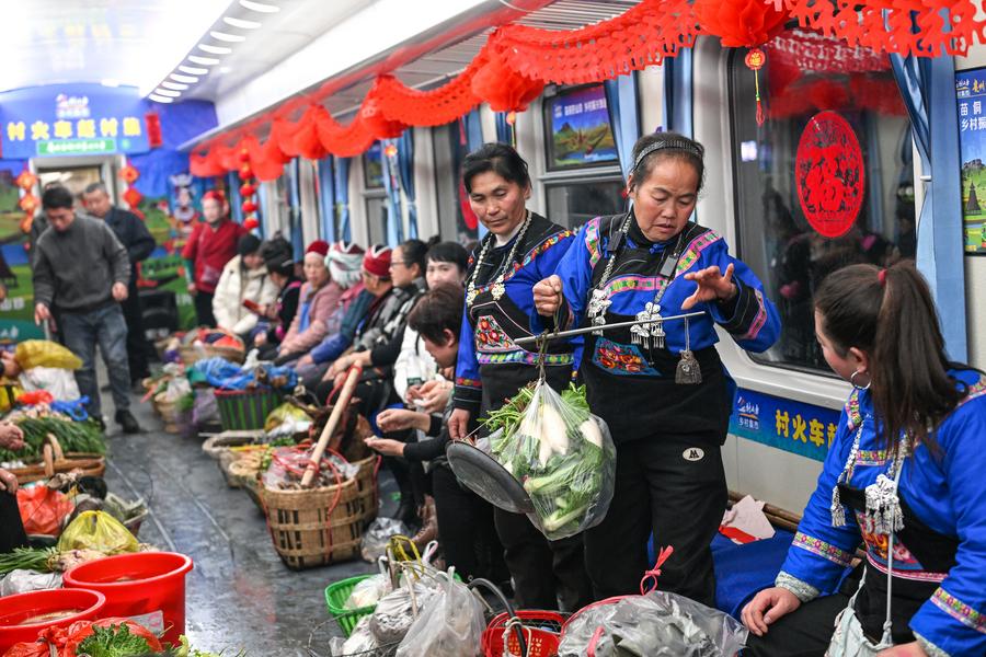 | Penduduk kampung membeli barangan di dalam kereta api. (Xinhua/Yang Wenbin) |
