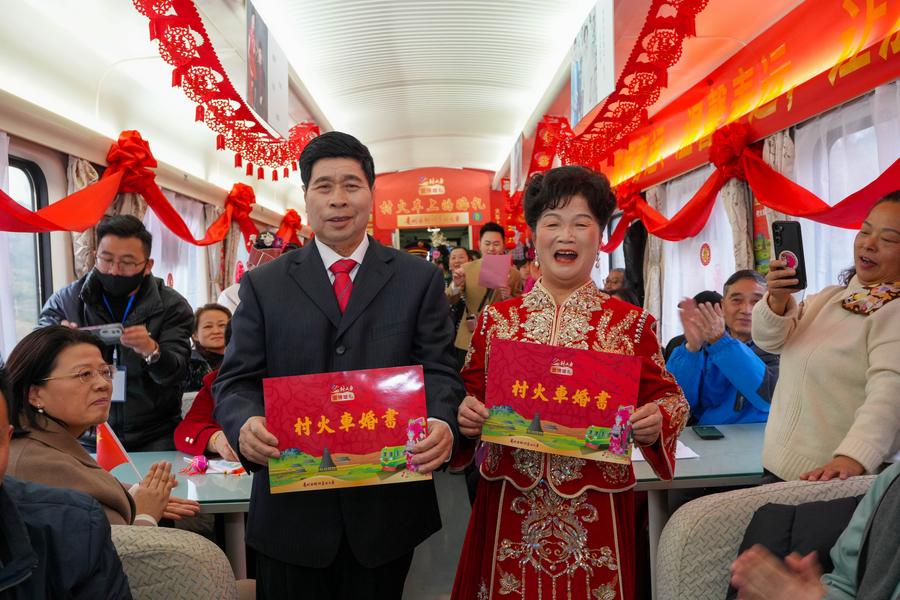 | Sepasang pasangan meraikan ulang tahun perkahwinan ke-50 di dalam kereta api. (Xinhua/Long Jianrui) |