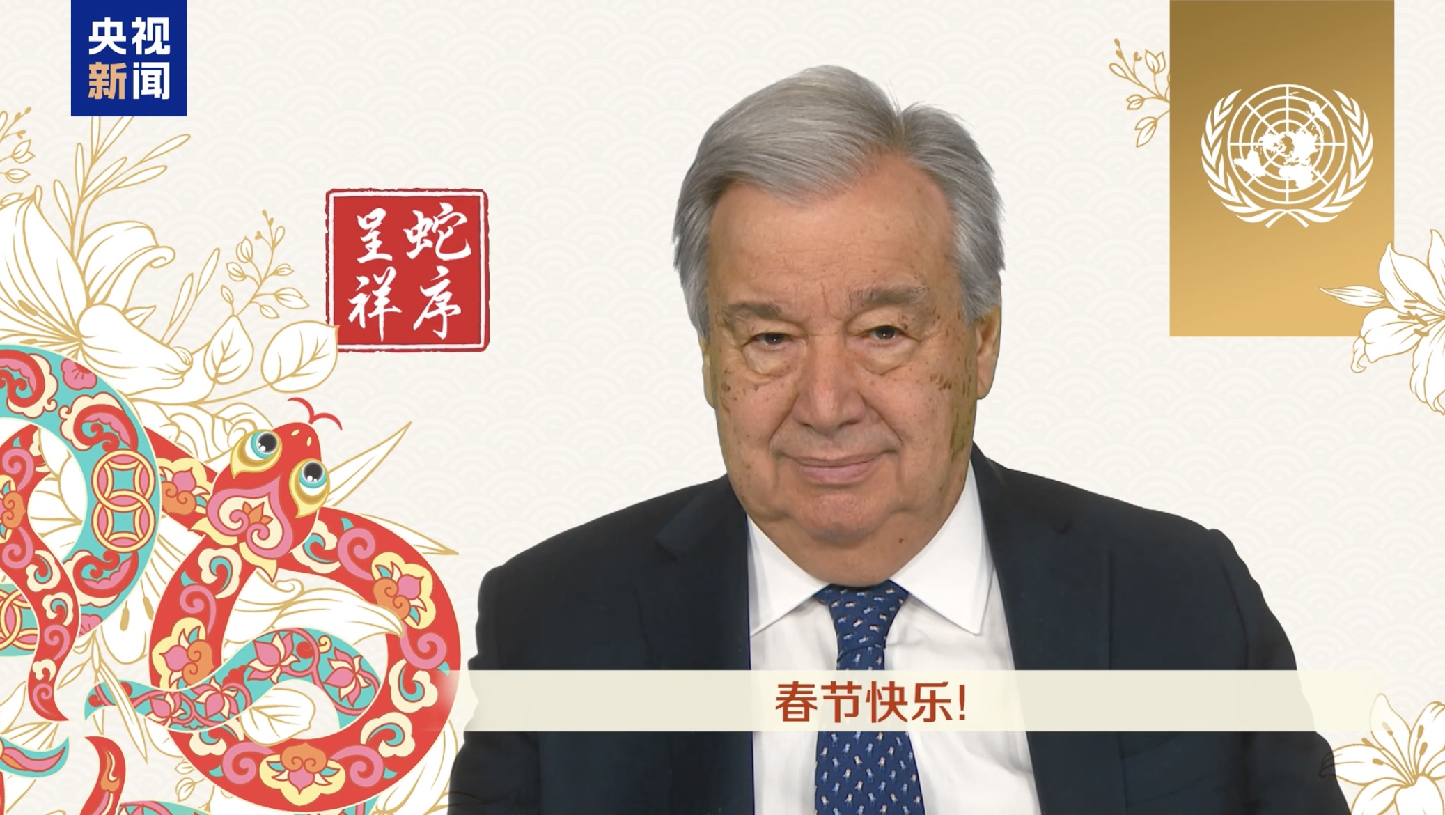 Setiausaha Agung Pertubuhan Bangsa-Bangsa Bersatu (PBB), Antonio Guterres pada Jumaat menyampaikan ucapan video, mengucapkan selamat Tahun Baharu Cina (TBC) kepada seluruh dunia, sempena ketibaan Tahun Ular.