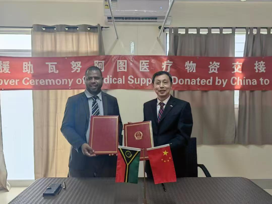 Majlis serah terima bekalan perubatan China kepada Vanuatu diadakan di Port Vila, ibu negara Vanuatu pada Khamis, dihadiri Duta Besar China ke Vanuatu Li Minggang dan Menteri Kesihatan Vanuatu Tari Quetu.