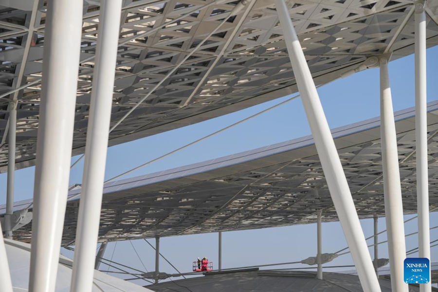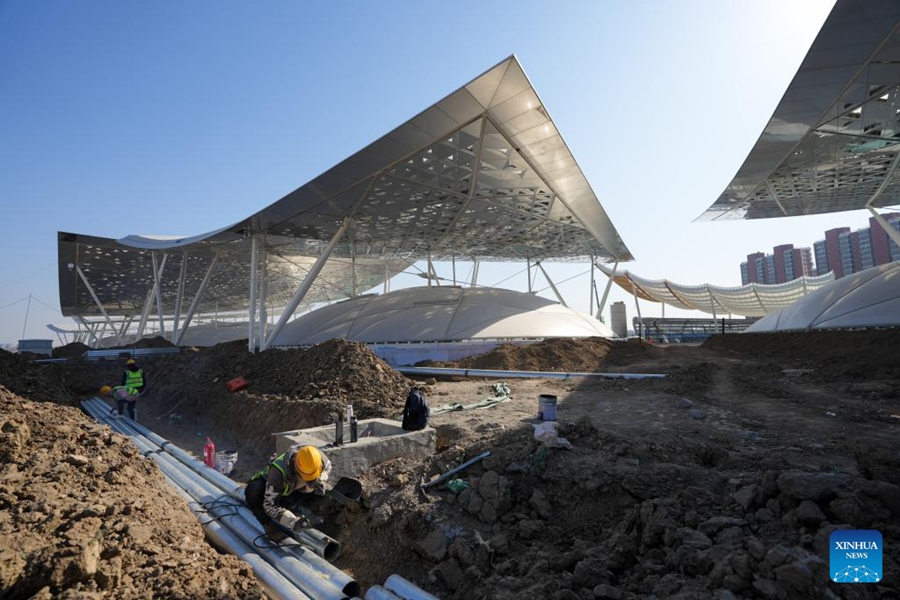 | Pekerja di tapak pembinaan hab pengangkutan bersepadu subpusat Beijing di daerah Tongzhou, 26 Februari 2025. (Xinhua/Ju Huanzong) |