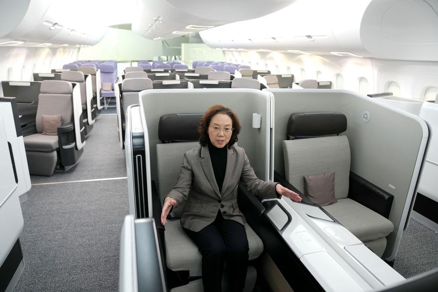 | Zhao Chunling memperkenalkan reka bentuk kabin di dalam model pesawat C929 di institut penyelidikan COMAC pada 5 Mac 2025. (Xinhua/Liu Ying) |