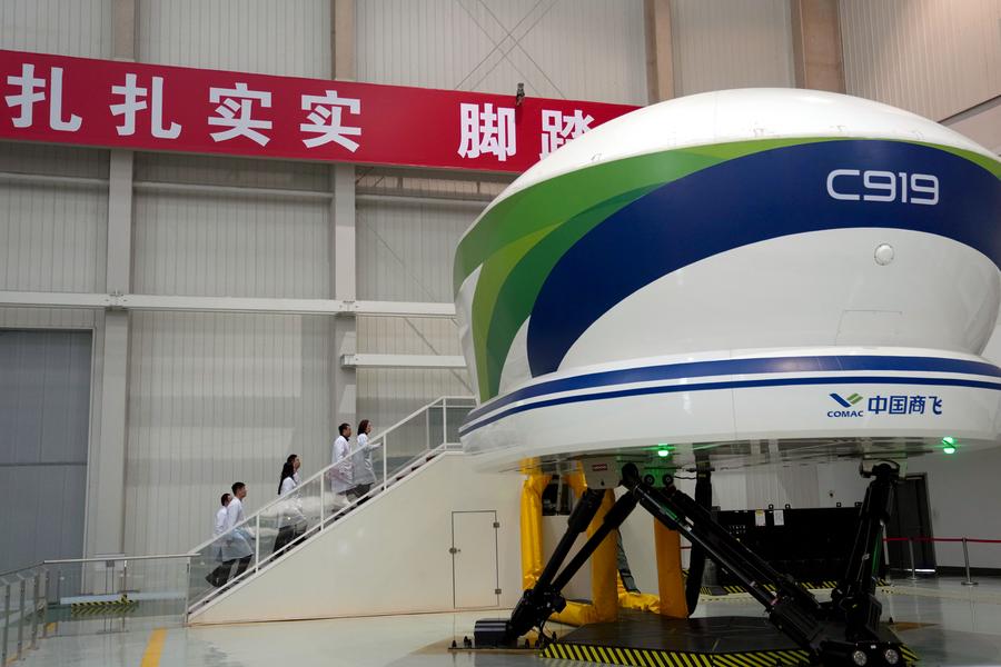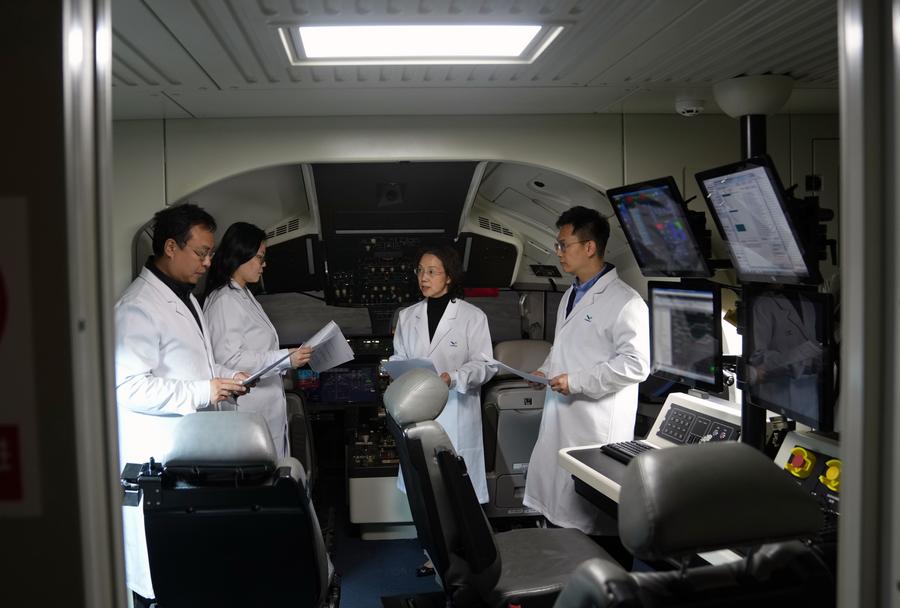 | Zhao Chunling (dua dari kanan) bersama-sama pasukannya berada di dalam simulator kejuruteraan pesawat C919 di institut penyelidikan COMAC pada 5 Mac 2025. (Xinhua/Liu Ying) |