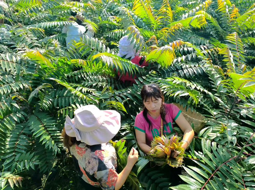 | Orang ramai sedang memiliih pucuk mahogani Cina. (Foto ihsan kerajaan tempatan perbandaran Xuangang, bandar Mangshi, Kawasan Autonomi Dehong Dai dan Jingpo) |