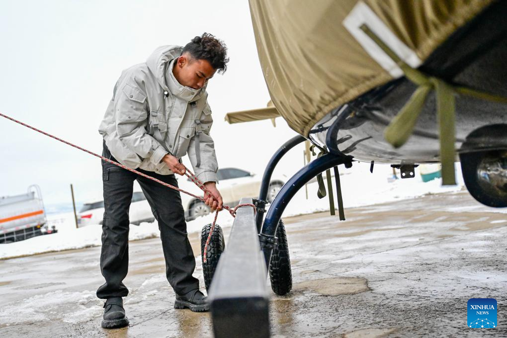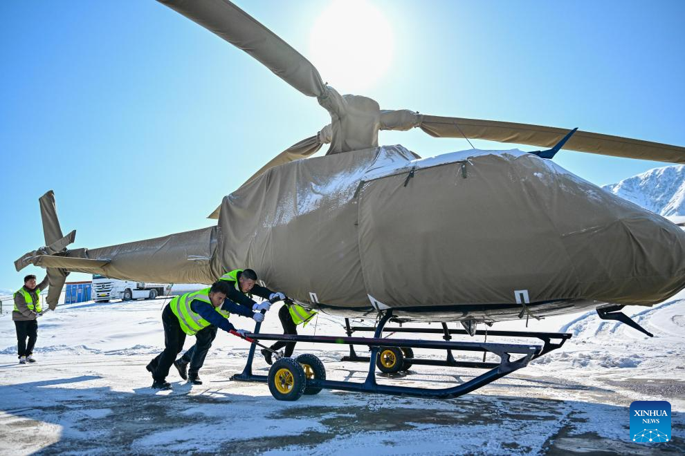 | Mirbek Tlobek menguruskan helikopter di sebuah syarikat penerbangan am di kawasan autonomi Kazakh Ili, wilayah Xinjiang, barat laut China, 4 Mac 2025. (Xinhua/Ding Lei) |