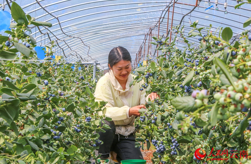 | Seorang penduduk kampung memetik beri biru di sebuah tapak penanaman di Kaunti Autonomi Yi Yangbi, Kawasan Autonomi Bai Dali, Provinsi Yunnan, barat daya China. (People’s Daily Online/Hu Zunhui) |