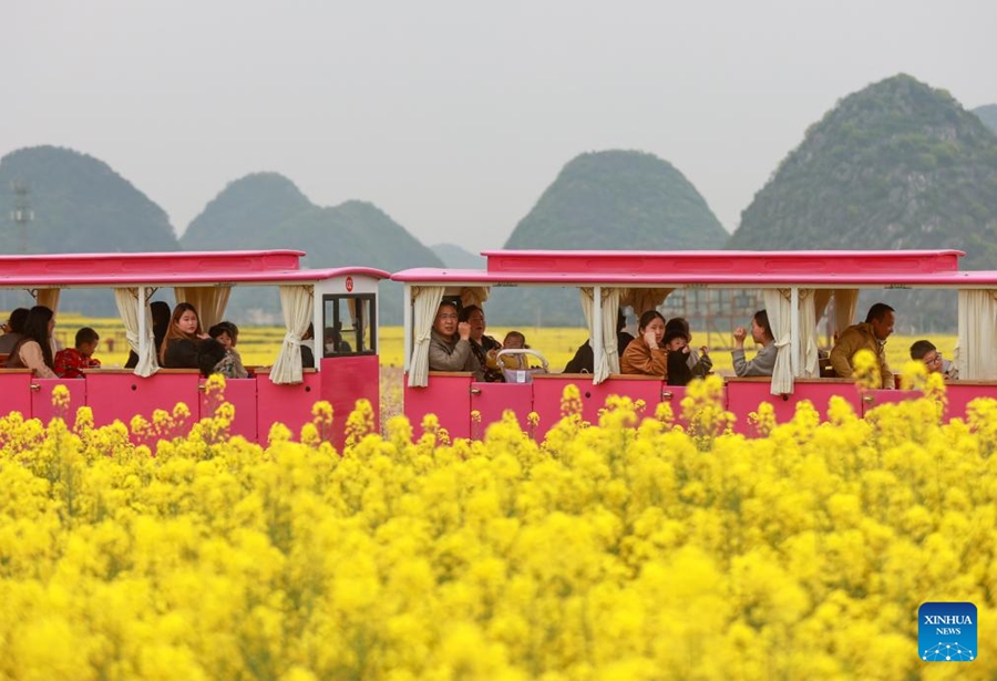 | Orang menaiki kereta api persiaran merentasi padang bunga kol di kampung Pingyuan, bandar Anshun, provinsi Guizhou, barat daya China, 6 April 2025. (Foto Oleh Yuan Fuhong/Xinhua) |