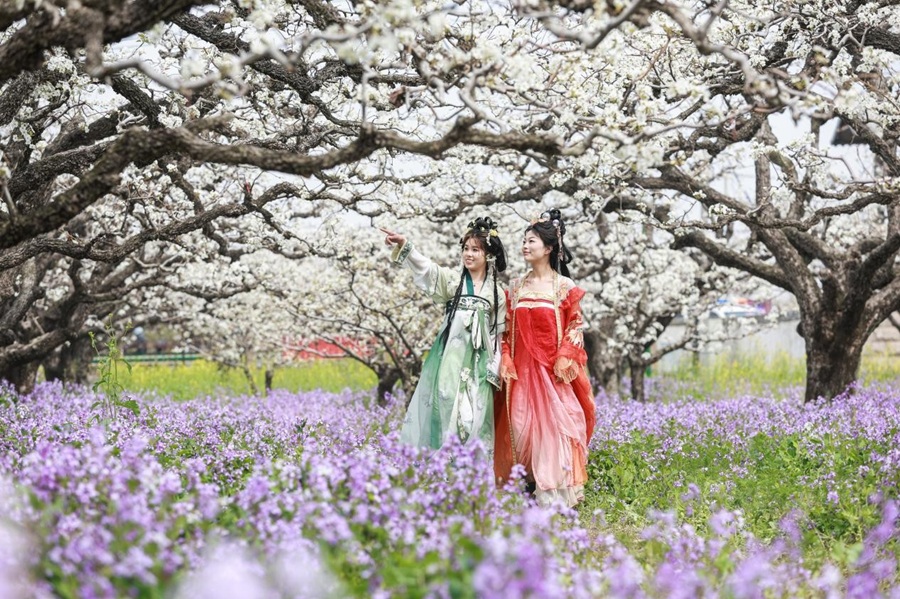 | Pelancong berpakaian Hanfu menghayati kecantikan bunga di kebun pear di Dangshan, Anhui. (People’s Daily Online/Zhang Jun) |