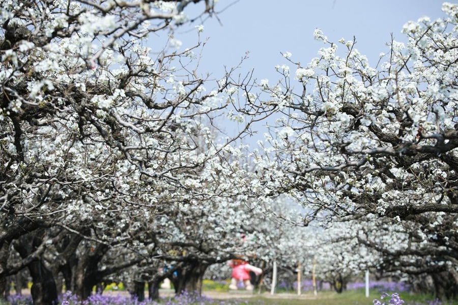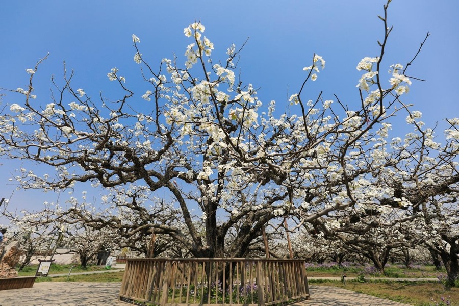 | Raja pokok pear di bawah langit membiru bermekaran umpama salji memutih. (People’s Daily Online/Zhang Jun) |
