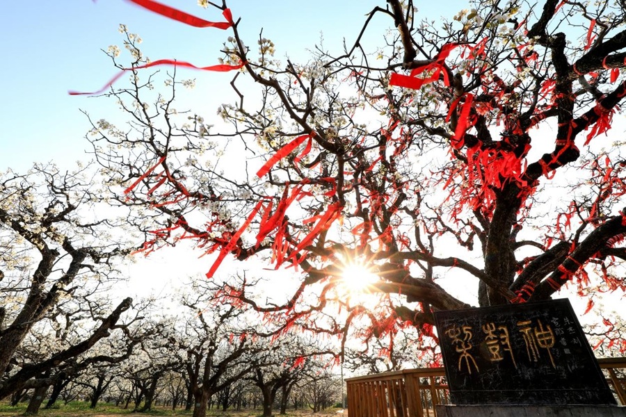 | Sebatang pokok pear tua di Taman Pear Dangshan, Anhui, dipenuhi gegantung doa. (People’s Daily Online/Zhang Jun) |
