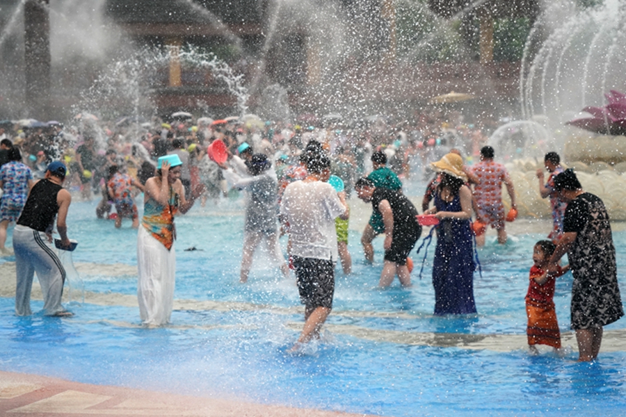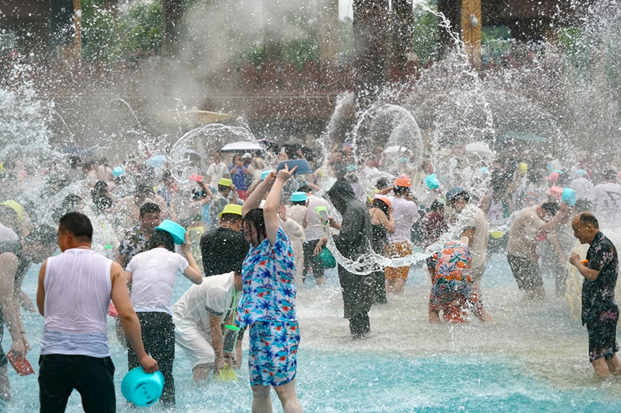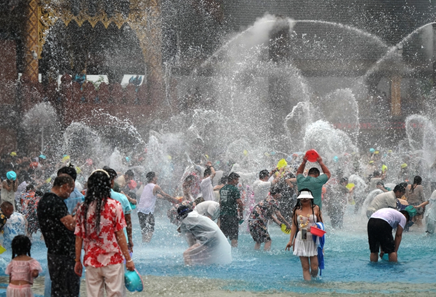 | Foto para pelancong yang sedang seronok menyimbah air antara satu sama lain di taman kebudayaan di Kawasan Autonomi Dai Xishuangbanna di Provinsi Yunnan, barat daya China pada 7 April 2025. (vip.people.com/Zhou Guoqiang) |