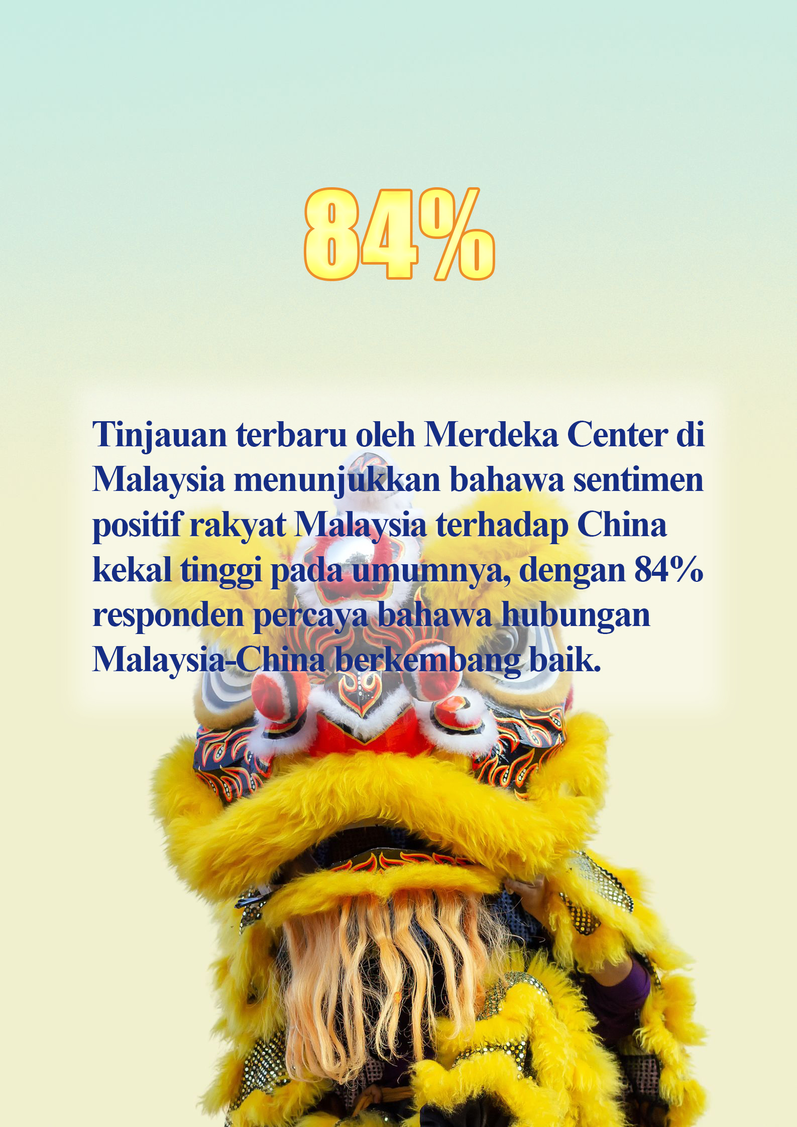 Tinjauan terbaru oleh Merdeka Center di Malaysia menunjukkan bahawa sentimen positif rakyat Malaysia terhadap China kekal tinggi pada umumnya, dengan 84% responden percaya bahawa hubungan Malaysia-China berkembang baik.