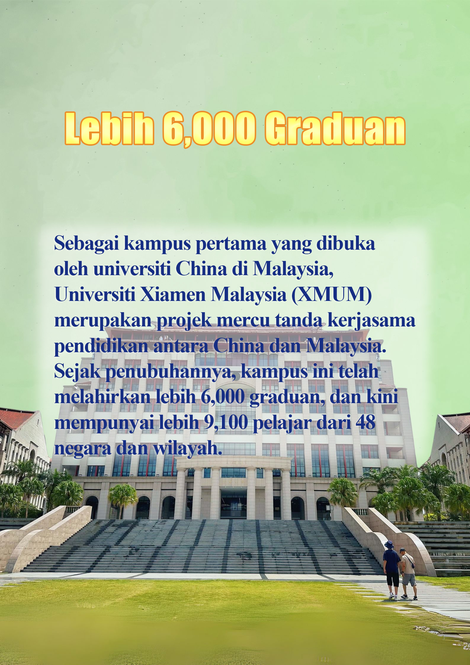 Sebagai kampus pertama yang dibuka oleh universiti China di Malaysia, Universiti Xiamen Malaysia (XMUM) merupakan projek mercu tanda kerjasama pendidikan antara China dan Malaysia. Sejak penubuhannya, kampus ini telah melahirkan lebih 6,000 graduan, dan kini mempunyai lebih 9,100 pelajar dari 48 negara dan wilayah. XMUM telah memupuk banyak bakat berkualiti tinggi untuk menyemarakkan persahabatan antara China dan Malaysia.