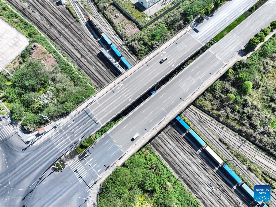 | Foto yang diambil menggunakan dron pada 20 April 2025, memaparkan kereta api kargo China-Asia Tengah yang sedang menunggu untuk berlepas dari Stesen Tuanjiecun di Chongqing, barat daya China. (Xinhua/Tang Yi) |