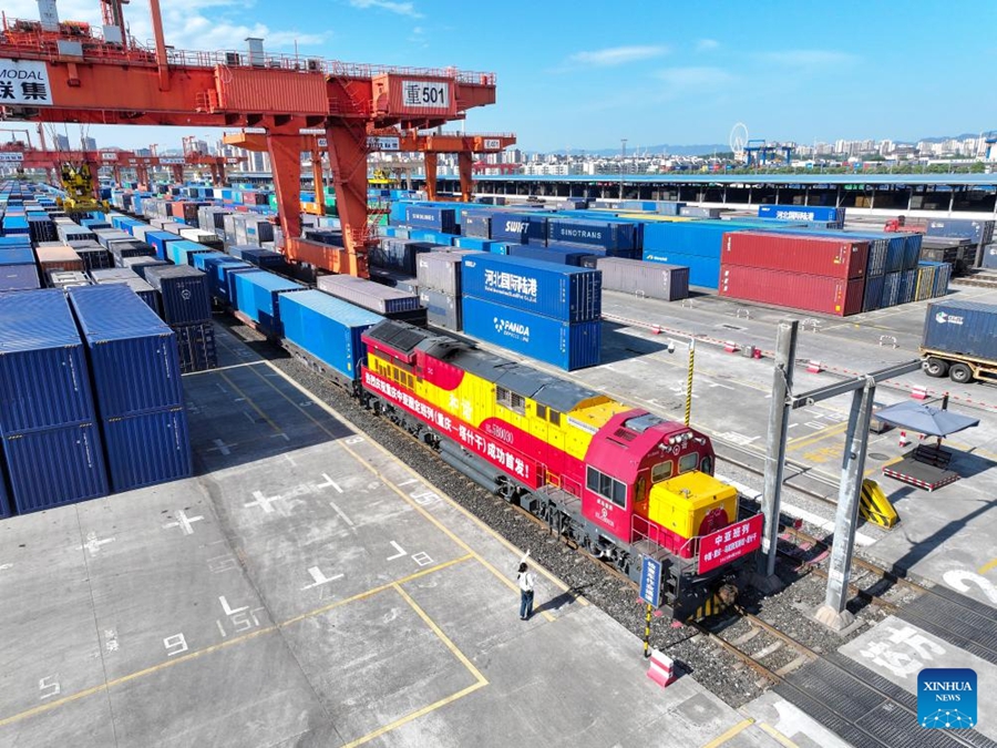 | Kereta api kargo China-Asia Tengah berlepas dari Stesen Tuanjiecun di Chongqing, barat daya China. (Xinhua/Tang Yi) |