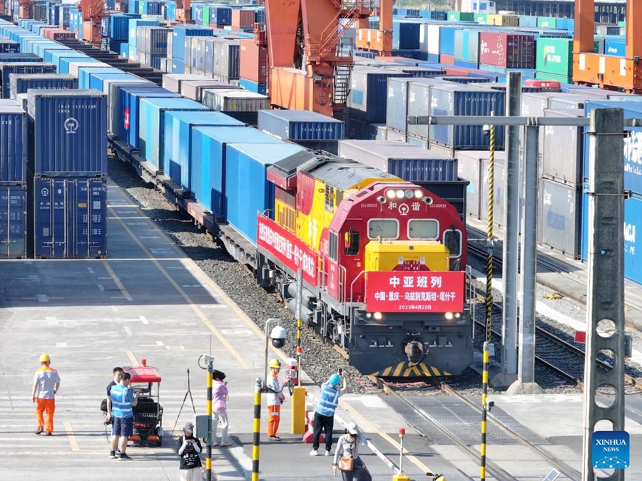 | Kereta api kargo China-Asia Tengah yang sedang menunggu untuk berlepas dari Stesen Tuanjiecun di Chongqing, barat daya China pada 20 April 2025. (Xinhua/Tang Yi) |