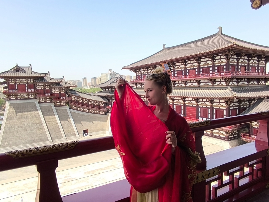 | Pengunjung membuat gaya semasa bergambar di muzium tapak Yingtianmen Taman Tapak Arkeologi Kebangsaan Bandar Luoyang Sui-Tang di Luoyang, Provinsi Henan di tengah China. (People’s Daily Online/Lu Yang) |