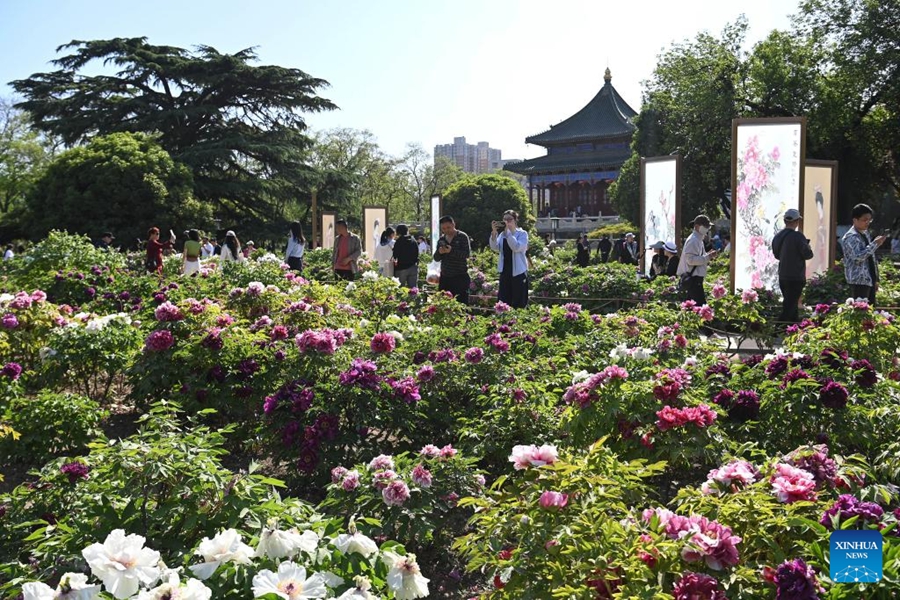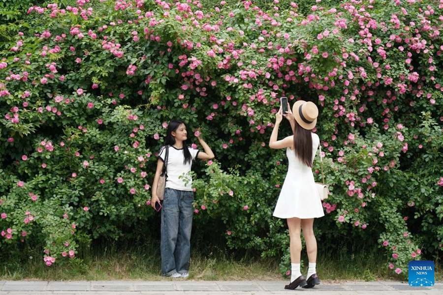 | Pengunjung bergambar dengan latar belakang bunga yang kembang bermekaran di sebuah taman di Xi’an, di Provinsi Shaanxi di barat laut China pada 25 April 2025. (Xinhua/Shao Rui) |